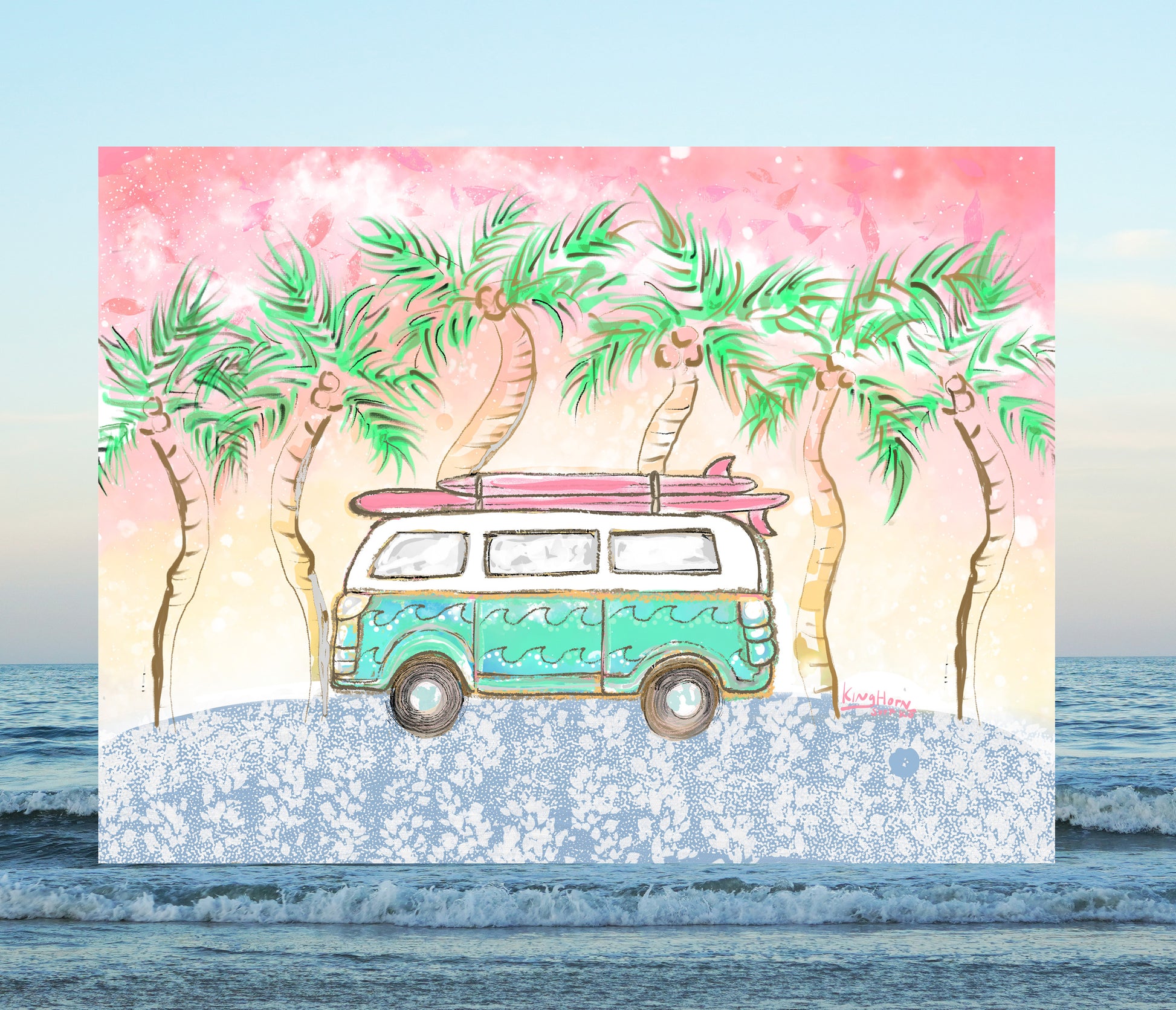 Hop aboard the Surfside Ride—a charming floral and teal beach bus loaded with surfboards and ready to roll toward the waves. Hand-drawn by artist Britney Kinghorn, this lively piece combines tropical florals with coastal cool, capturing the spirit of adventure and endless summer days.