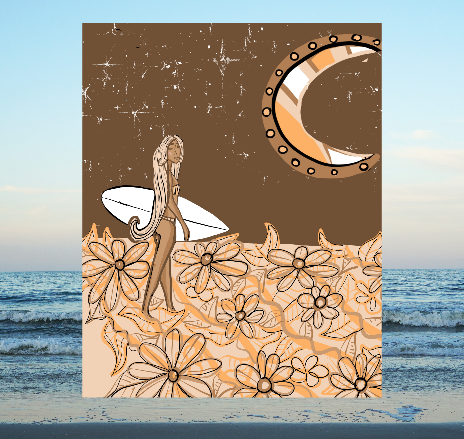 Graceful and free-spirited, Floral Tide features a serene surfer girl walking toward the shoreline, her surfboard adorned with a delicate floral design. Hand-drawn by artist Britney Kinghorn, this piece blends femininity and strength—capturing the quiet power of a woman drawn to the waves.