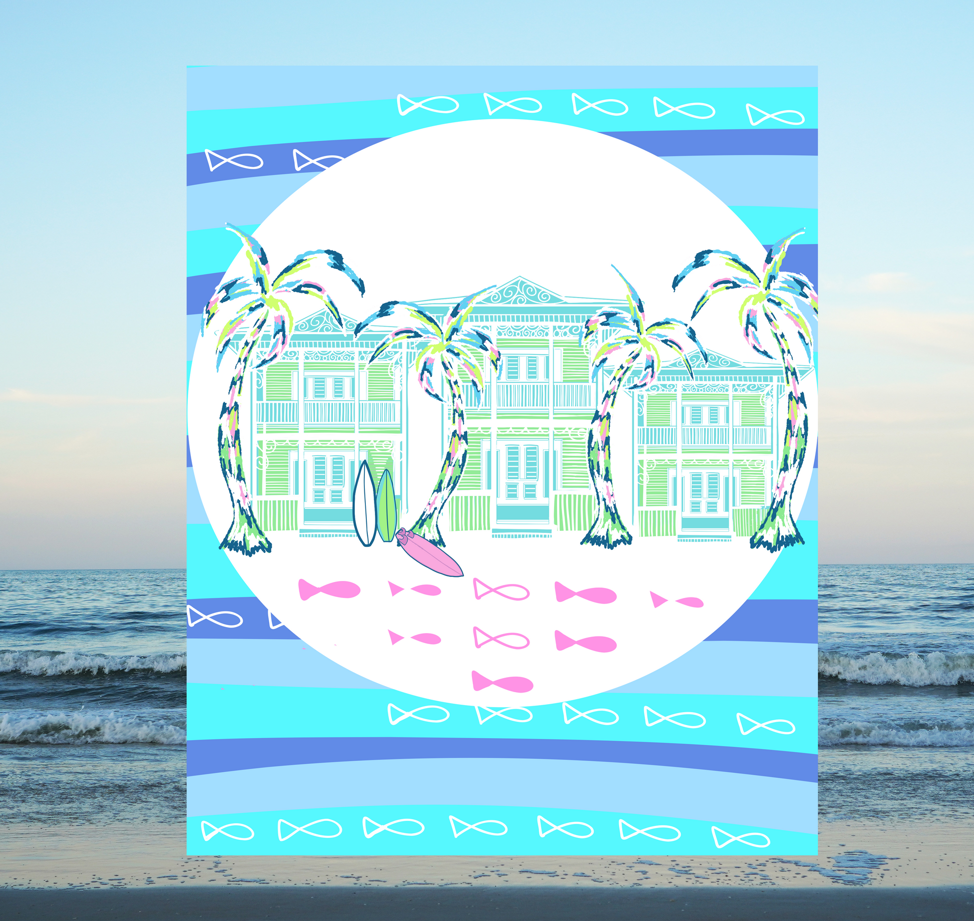 Full of personality and coastal charm, Funky Coastline showcases a row of quirky green beach houses, swaying palm trees, and playful fish shapes swimming through the scene. Hand-drawn by artist Britney Kinghorn, this vibrant piece blends tropical whimsy with bold, modern flair.