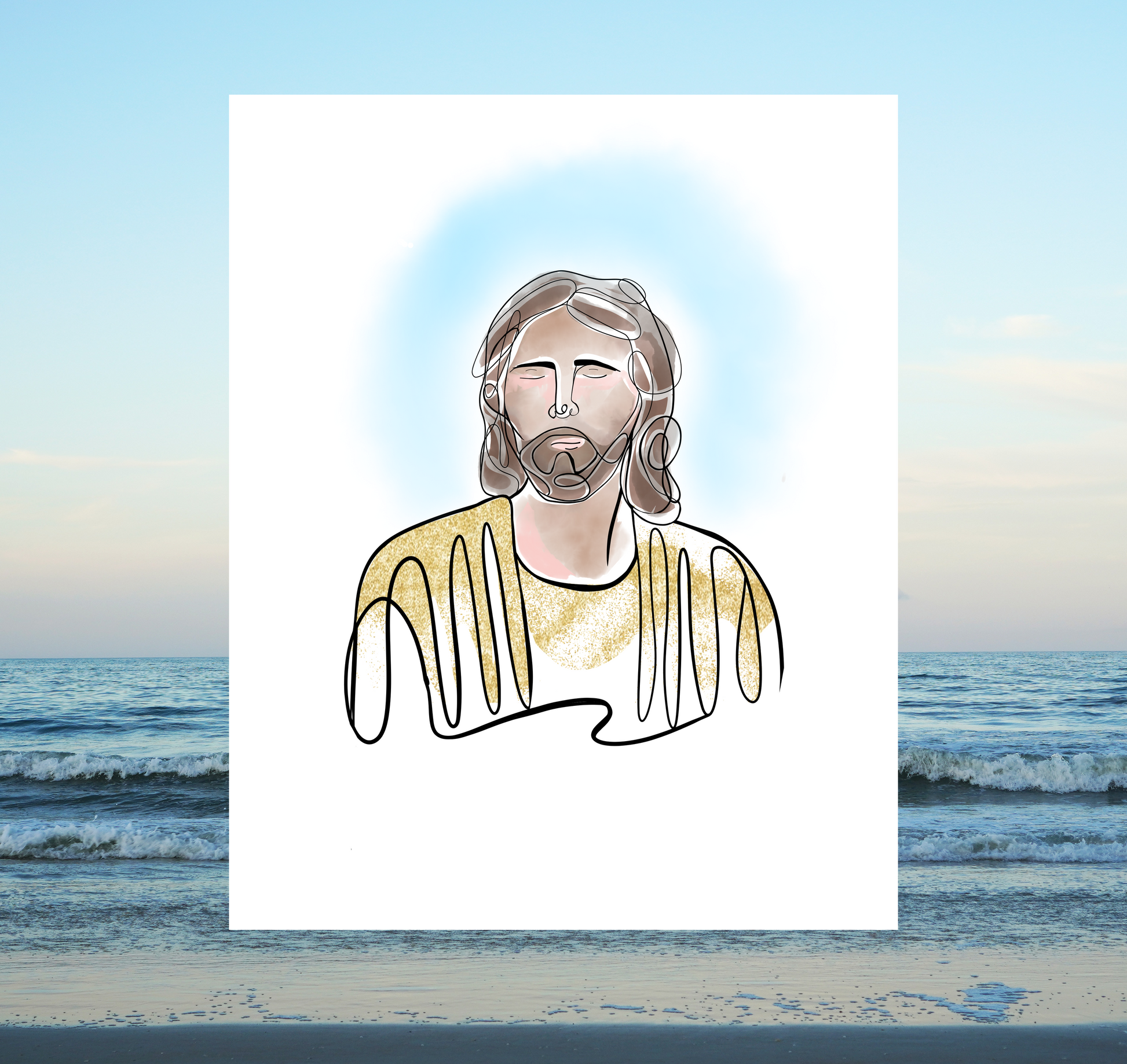 Graceful and reverent, Prince of Peace features a delicate line art portrait of Jesus Christ, rendered in soft pale blues and neutral tones. This minimalist design by artist Britney Kinghorn captures the quiet strength and deep serenity of the Savior with a calming, modern aesthetic.