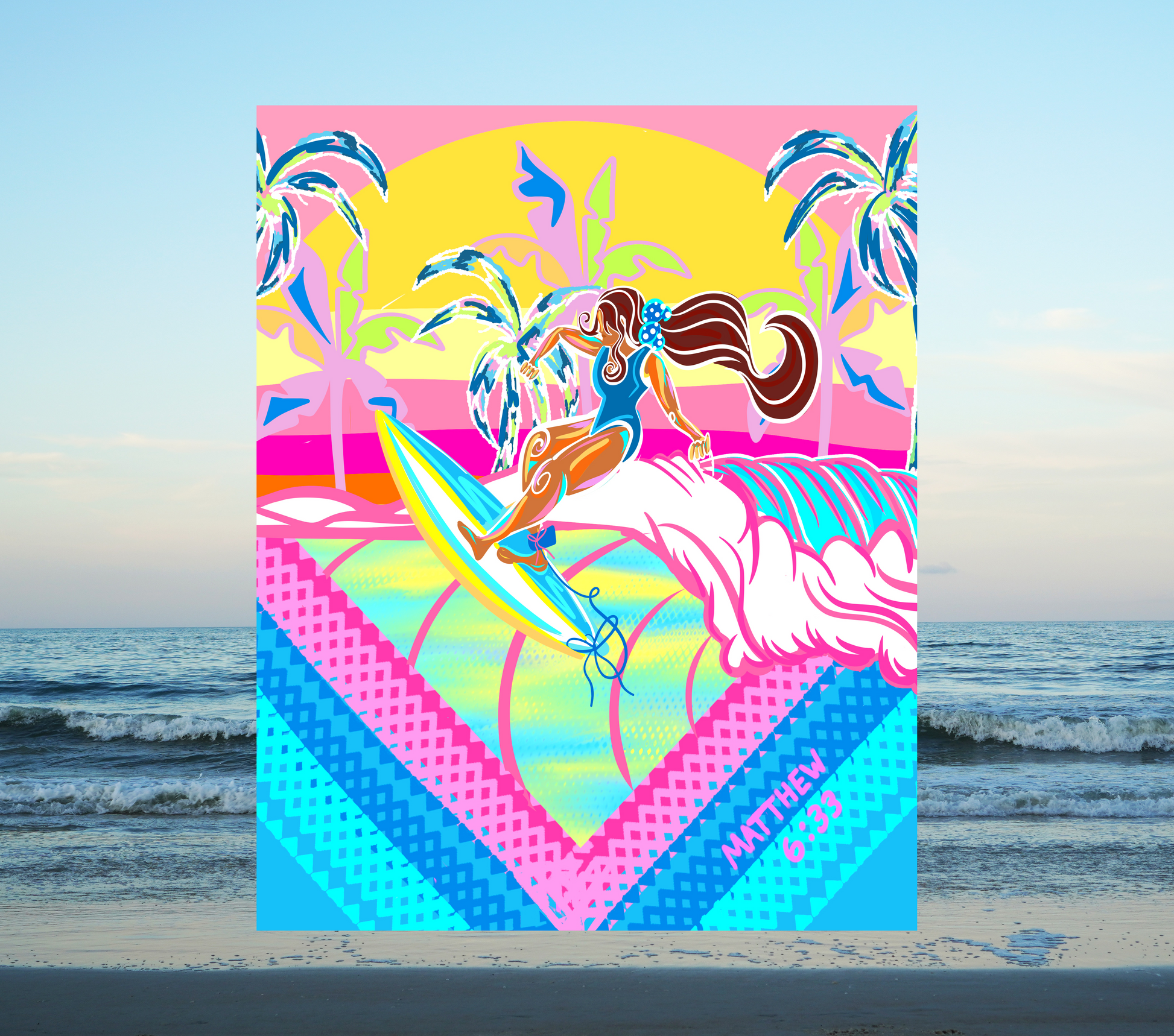 Bright, bold, and bursting with retro vibes—this vibrant art print features a fearless girl surfing in full color, shredding the gnar with effortless style. Drenched in tropical tones and 80s-inspired energy, it captures the pure joy of catching waves and living life loud.